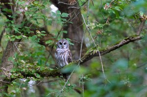 Resident barred owl perched in tree just before sunrise